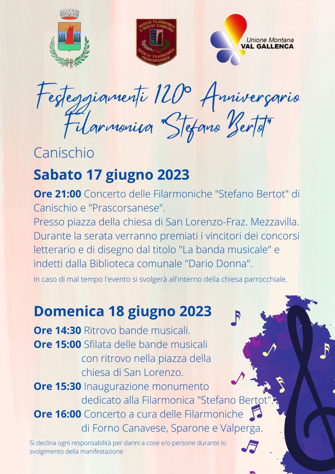 | Organizzazione | Filarmonica "Stefano Bertot", Comune di CANISCHIO, Proloco |