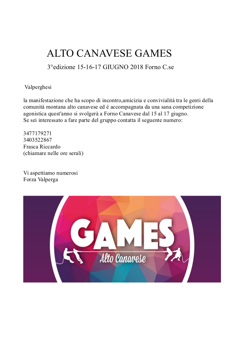 Alto Canavese Games 2018 Forno 15-16-17 giugno