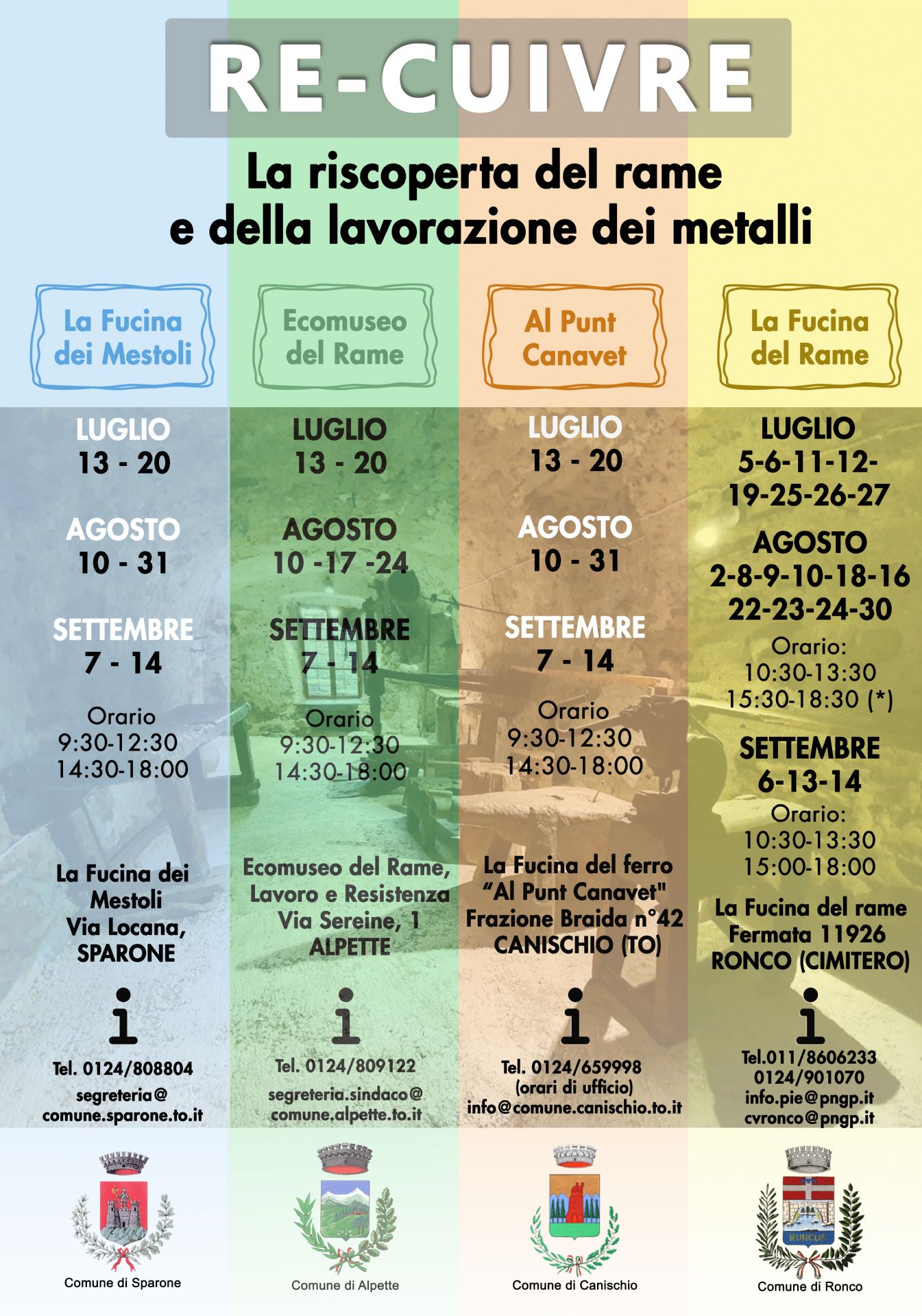 Calendario delle aperture estive delle fucine ed ecomusei dei Comuni di Canischio, Alpette, Ronco C.se e Sparone.