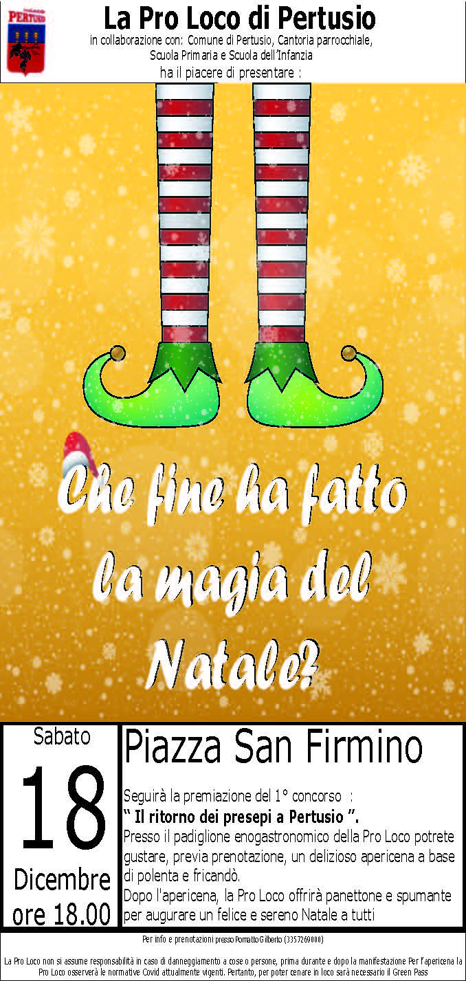 LA PRO LOCO DI PERTUSIO in collaborazione con: Comune di Pertusio, Cantoria parrocchiale, Scuola Primaria e Scuola dell' Infanzia organizza per SABATO 18 dicembre 2021 alle ore 18.00 in Piazza San Firmino, l' evento " CHE FINE HA FATTO LA MAGIA DEL NATALE ".