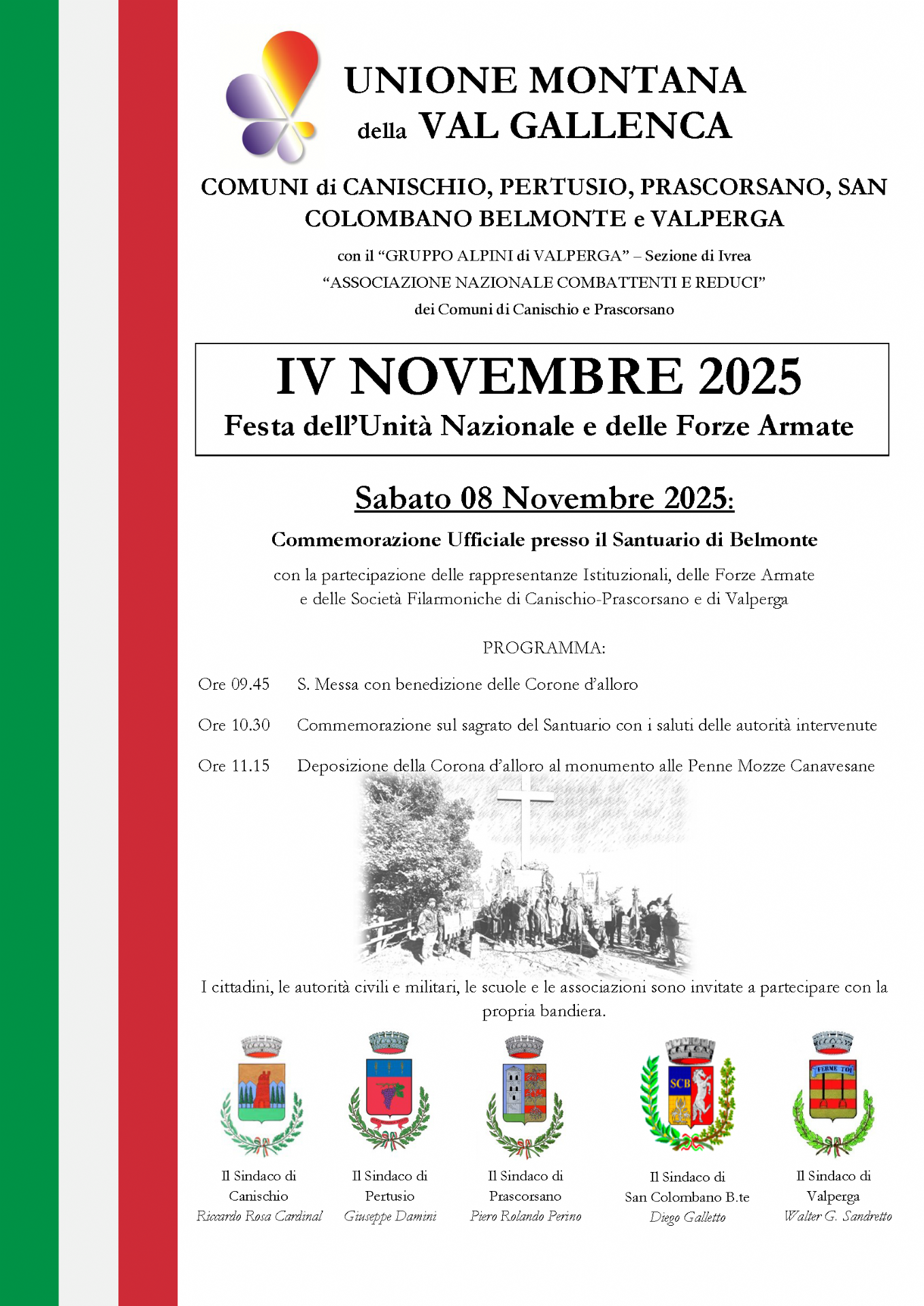 I Comuni di Canischio, Pertusio, Prascorsano, San Colombano Belmonte e Valperga con il “Gruppo Alpini di Valperga” – Sezione di Ivrea e “Associazione Nazionale Combattenti e Reduci” dei Comuni di Canischio e Prascorsano e la partecipazione delle rappresentanze Istituzionali, delle Forze Armate e delle Società Filarmoniche di Canischio-Prascorsano e di Valperga
