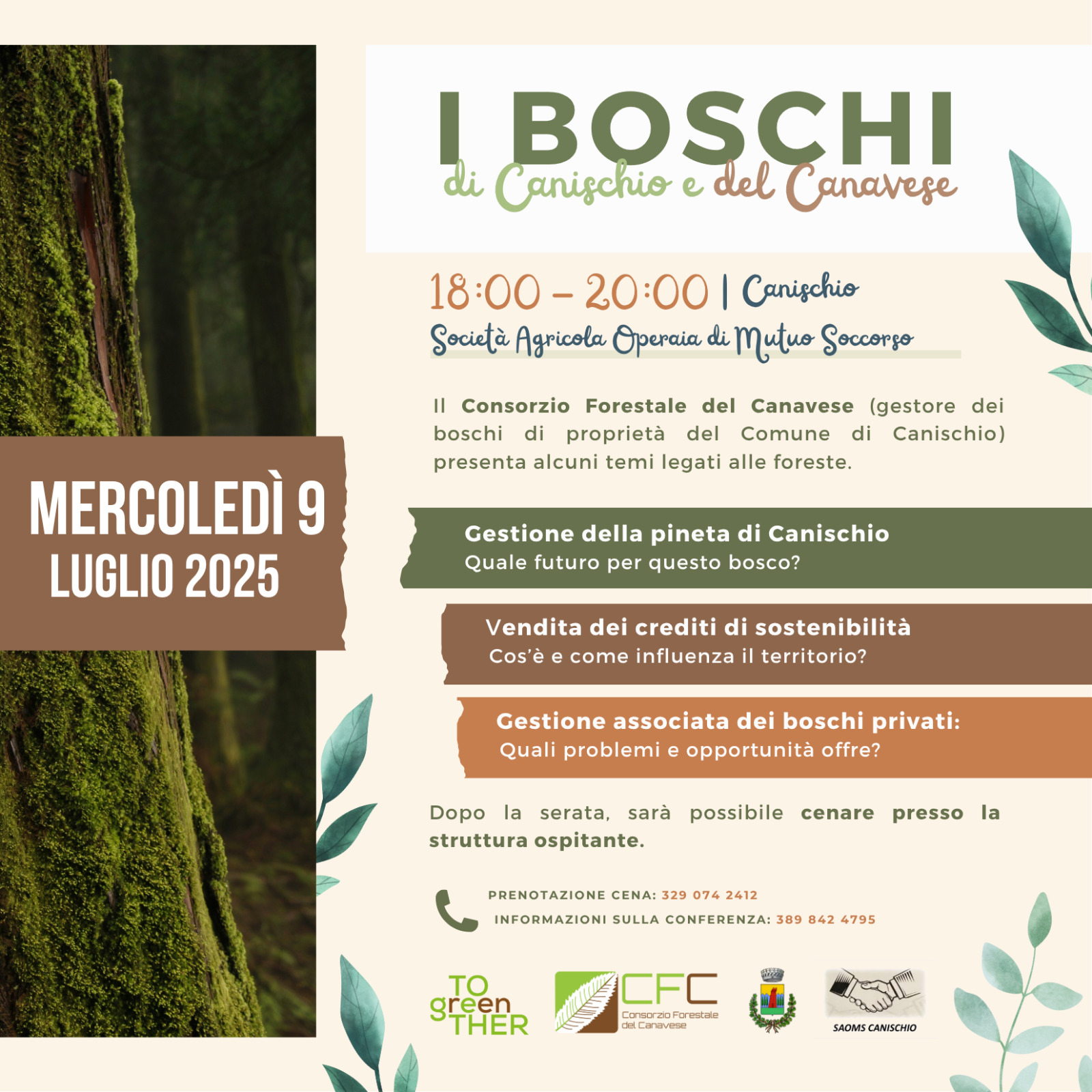 Il Consorzio Forestale del Canavese, ente gestore dei boschi di proprietà del Comune di Canischio, terrà una serata in cui verranno affrontati alcuni temi legati alla salvaguardia ed allo sfruttamento del bosco.