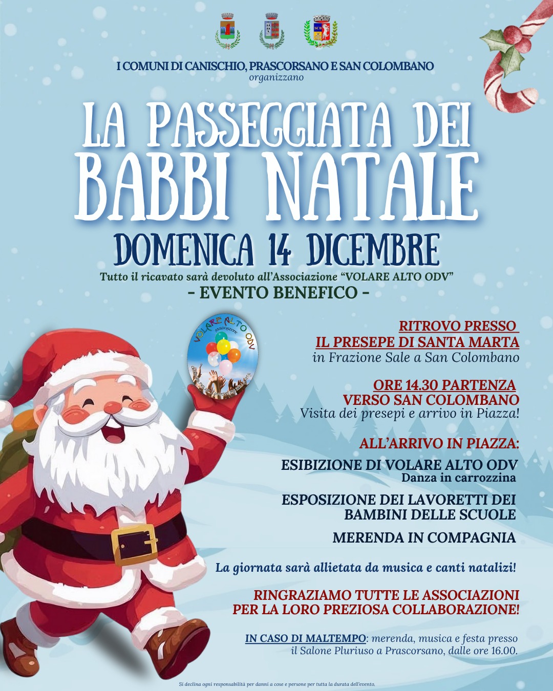 In collaborazione con il Comune di Canischio e di San Colombano, si organizza la seconda edizione della PASSEGGIATA DEI BABBI NATALE! 🎅🏻Un evento benefico, il cui ricavato andrà all'Associazione VOLARE ALTO ODV. ❤️