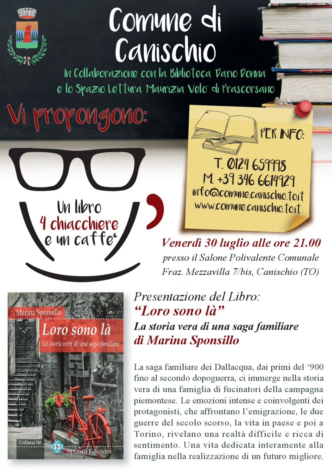La Biblioteca comunale "Dario Donna" di Canischio, in collaborazione con la Sala Lettura "Maurizio Velo" di Prascorsano, organizzano una serata con l'autore del nuovo romanzo: "Loro sono là", di Marina SPONSILLO.