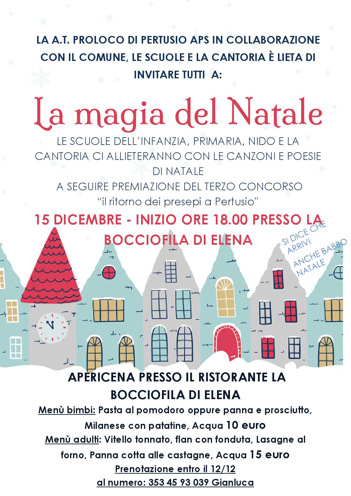 La A.T. Proloco di Pertusio in collaborazione con il Comune, le Scuole e la Cantoria e' lieta di invitare tutti al grandioso Spettacolo di Natale in programma per venerdi' 15 dicembre 2023 inizio ore 18.00 presso la Bocciofila di Elena in Via San Ponso nr. 22 a Pertusio.