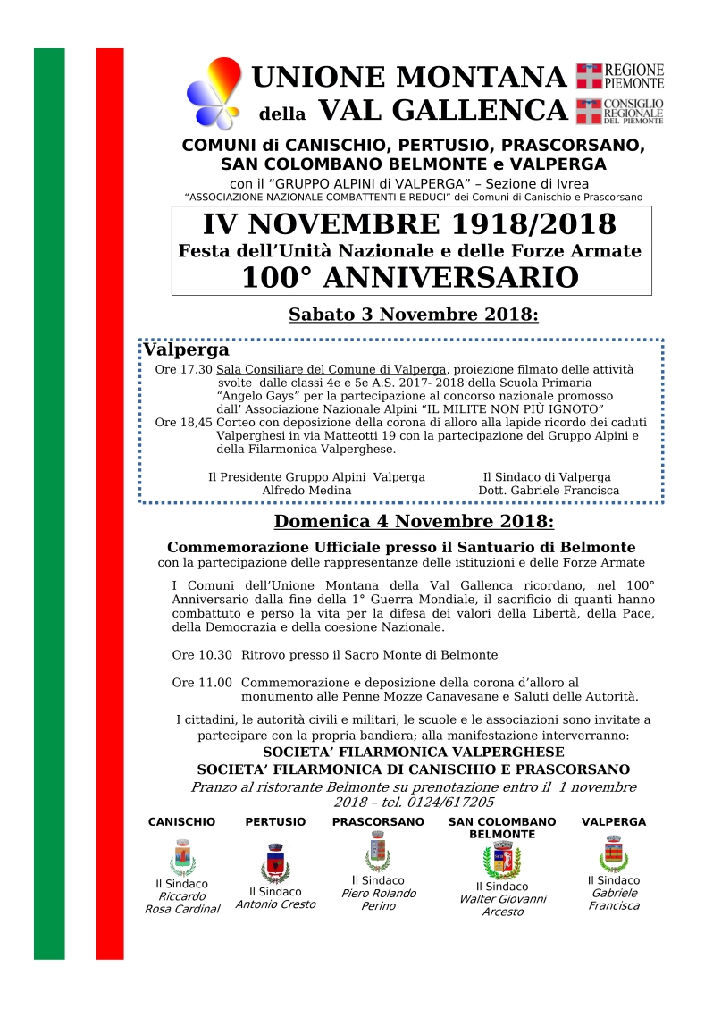 CELEBRAZIONI DEL 4 NOVEMBRE 2018 NEL CENTENARIO DELLA FINE DELLA 1a GUERRA MONDIALE