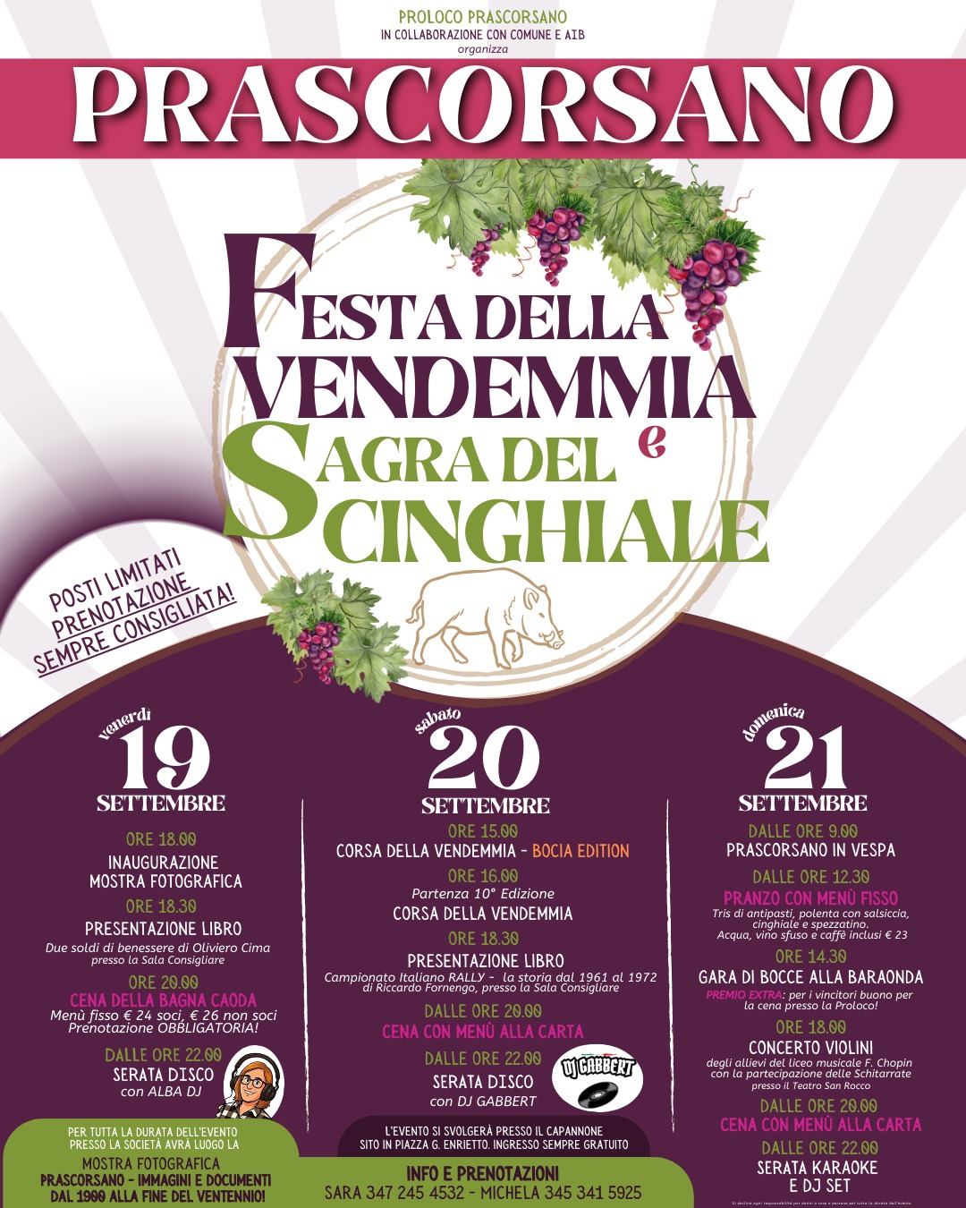 Arriva il primo sentore di autunno e con lui arriva immancabilmente anche la Festa maggiormente sentita a Prascorsano: la FESTA DELLA VENDEMMIA E SAGRA DEL CINGHIALE!