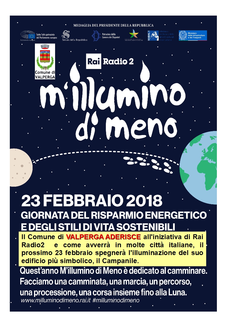 Il Comune di Valperga aderisce all'iniziativa di Rai Radio2 "m'illumino di meno" e come avverrà in molte altre città Italiane, il 23 febbraio spegnerà l'illuminazione del suo monumento simbolicamente più importante, il campanile.
