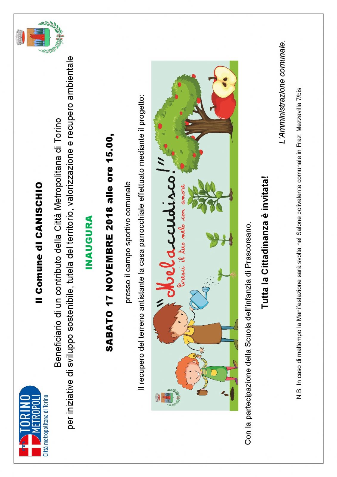 SABATO 17 NOVEMBRE Inaugurazione del meleto con la partecipazione della Scuola dell'infanzia di Prascorsano.