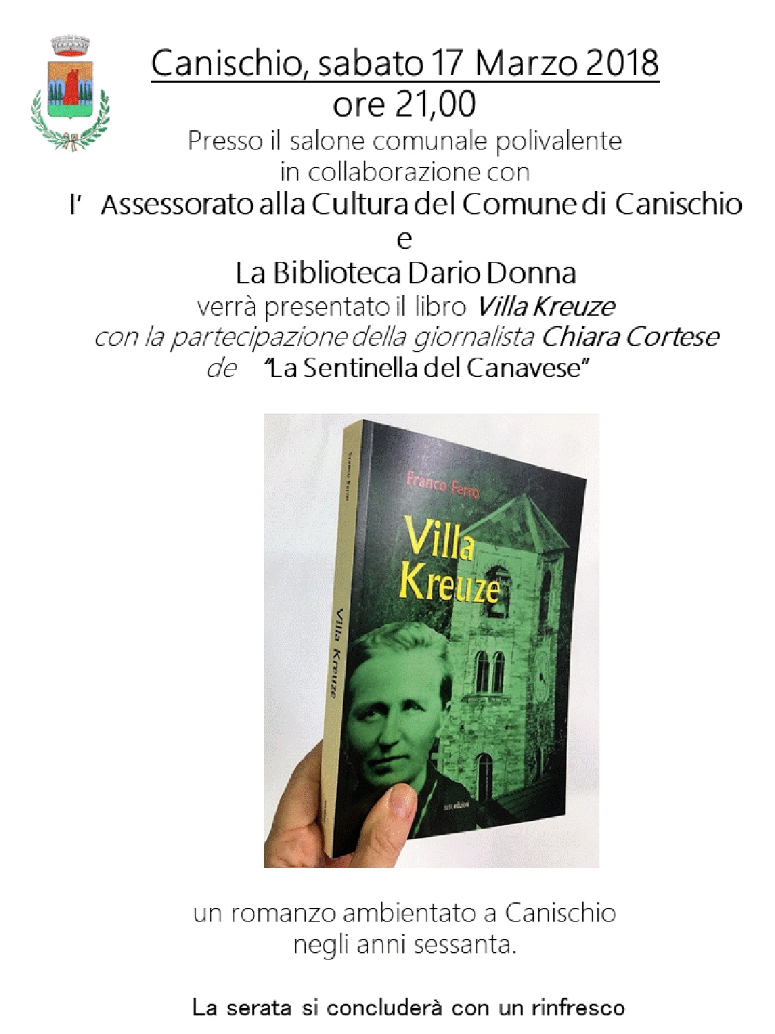 Sabato 17 Marzo, alle ore 21.00, presso il Salone comunale di Canischio, verrà tenuta la presentazione del Libro "Villa Kreuze" scritto dal Canischiese Ing. Franco FERRO.