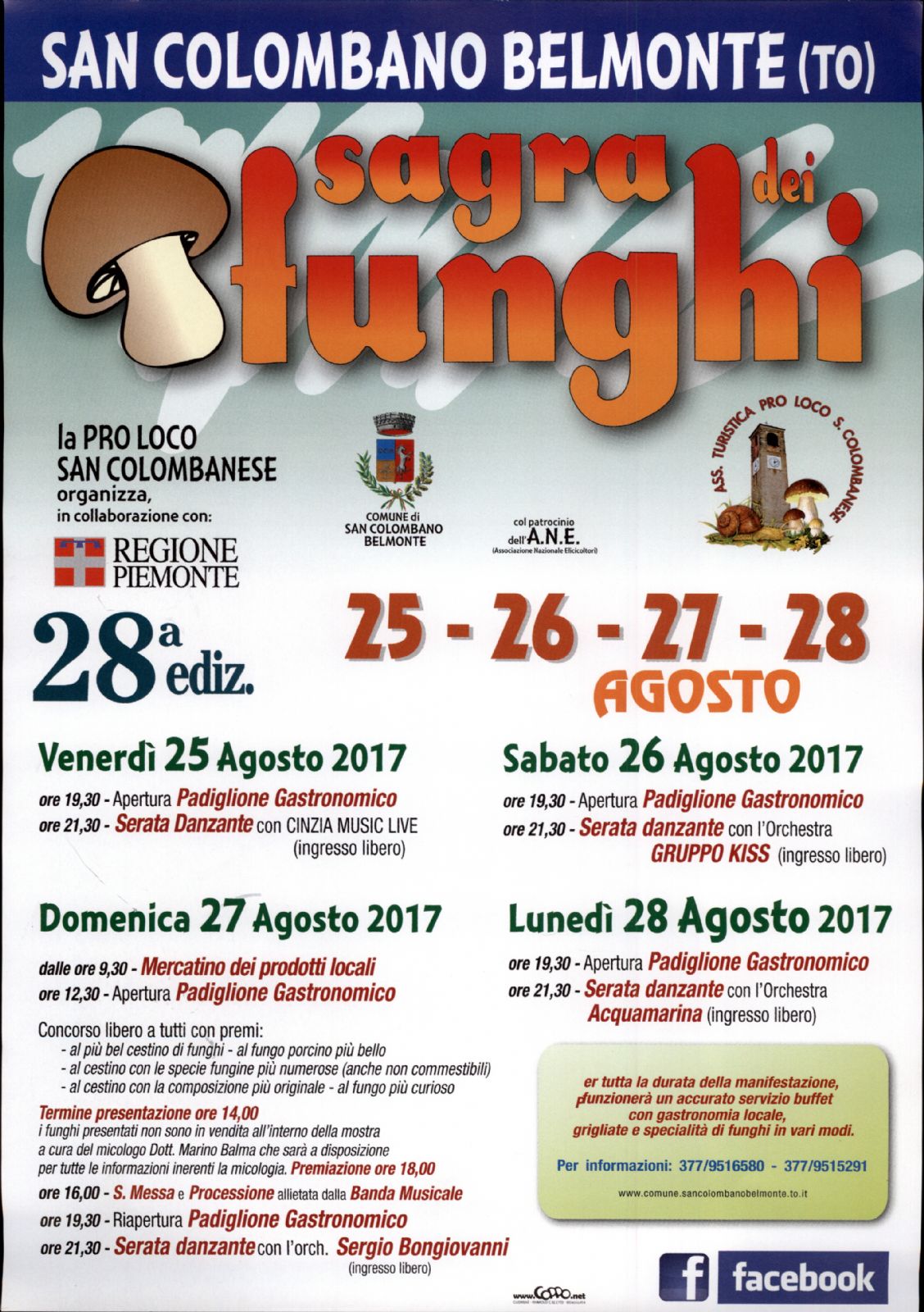 LA PRO LOCO SANCOLOMBANESE IN COLLABORAZIONE CON IL COMUNE E LA REGIONE PIEMONTE ORGANIZZA LA 28° EDIZIONE DELLA SAGRA DEI FUNGHI DA VENERDI' 25 AGOSTO A LUNEDI' 28 AGOSTO 2017