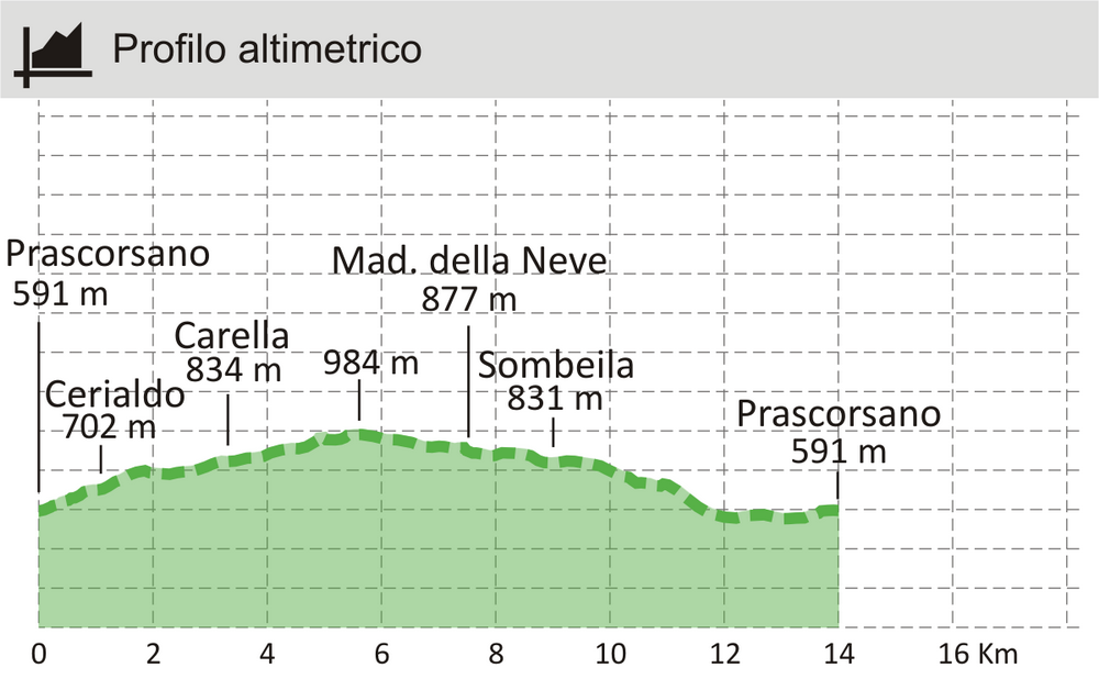 Questo percorso ha diversi punti d’accesso, ma noi consigliamo di iniziare la pedalata dal Comune di Prascorsano (588 mt) lungo la strada che porta in frazione Cerialdo (697mt) e prosegue fino alla frazione Carella di Pratiglione (841 mt) dove c’è un’area pic-nic e possiamo godere di un ottimo panorama.